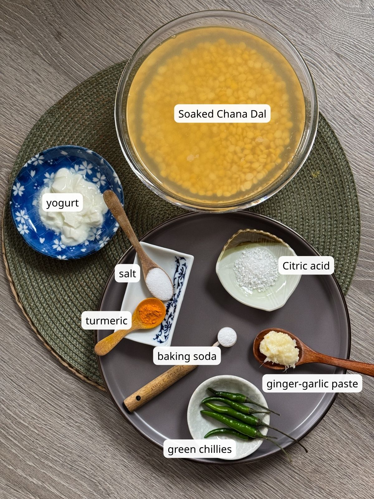 - Blend: In the morning, drain the dal and blend with ingredients mentioned into a slightly coarse, thick batter. Control the water: Start small and only add more if needed.2 teaspoon ginger-garlic paste, 5 green chillies, 4 teaspoon yogurt, 1.5 teaspoon salt, 1.5 teaspoon citric acid, ¼ teaspoon haldi (optional), ¾ cup water (see note)